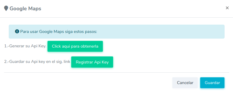 La ubicación para guardar Naps no es un campo requerido, pero si se desea usar este campo es necesario integrar su Api Key de google siguiendo los pasos de la ventana que aparecerá al seleccionar la opción "Ubicar en el mapa".