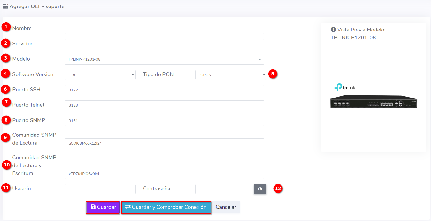 - Modelo: Modelo de la OLT a registrar.