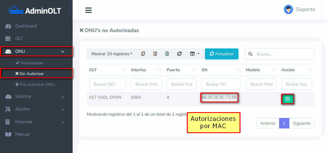 Al conectar un equipo a la OLT, este debe ser autorizado para poder establecer una conexión, a continuación se explican los pasos a seguir para autorizar Onu's en OLT's VSOL GPON desde AdminOLT.