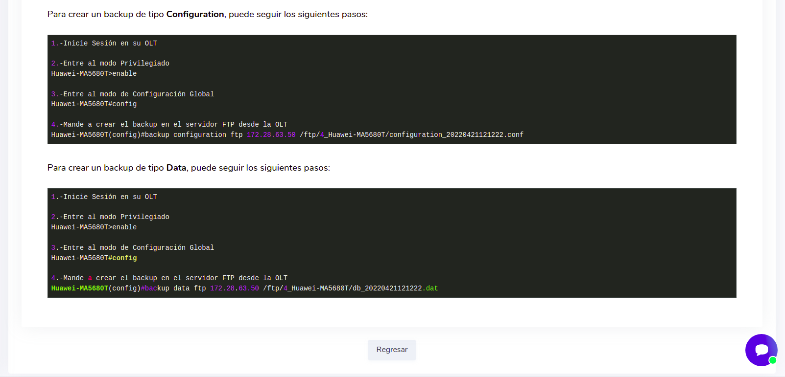 Las OLTs tienen la capacidad de hacer respaldos automáticos o si lo desea puede mandarlos a crear manualmente. Puede leer más sobre estas opciones en los siguientes enlaces: