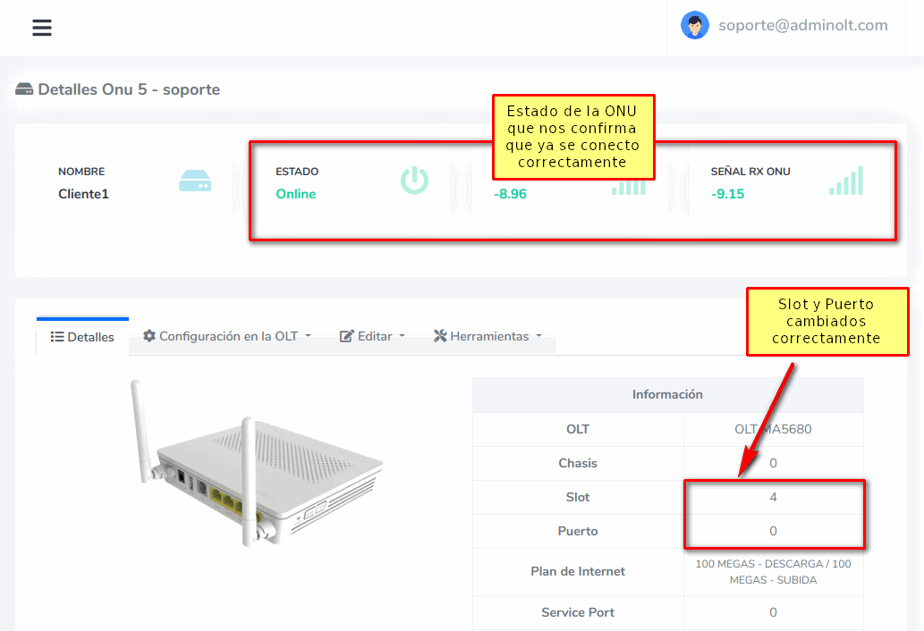 8 Cambiar ONU de Slot y Puerto fisicamente y verificar estado de la ONU