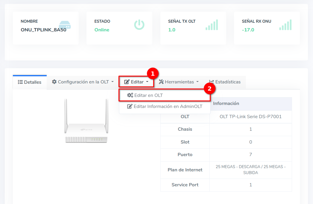 Dar click en el texto Editar en OLT que se encuentra en el botón con la leyenda Editar.