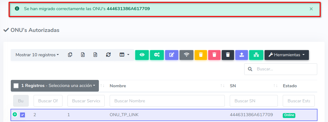 1 En ONU's > Lista de Onu's Autorizadas debemos escoger el equipo con el que se trabajará y seleccionar Migrar ONU a otra OLT que se encuentra en el botón con la leyenda Herramientas.