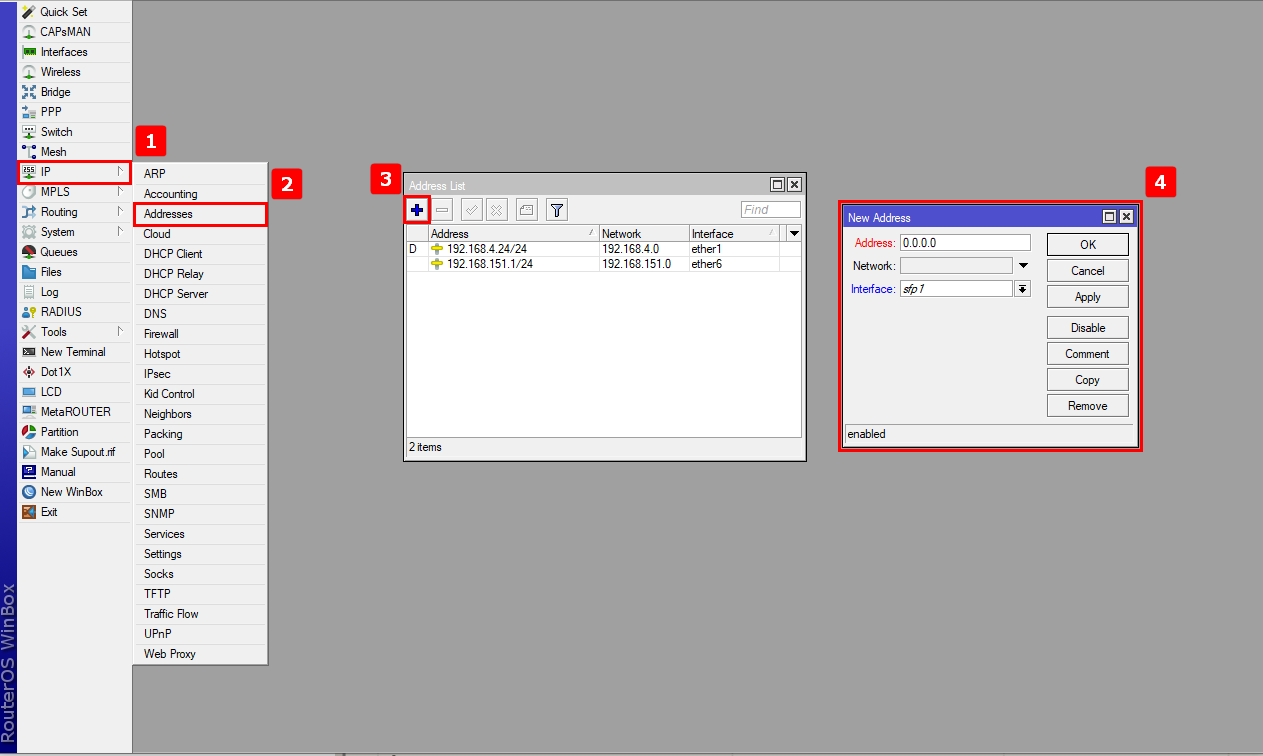 - 1.- Agregamos el segmento default de la OLT: 10.11.104.0/24 para que el mikrotik tenga comunicacion con la OLT