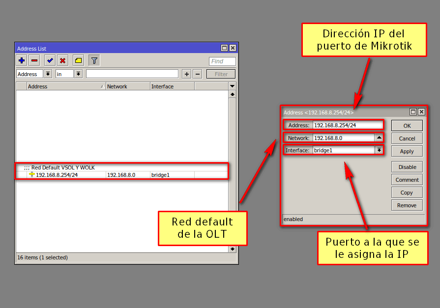 Vamos a crear un bridge para poder asignar una IP de la red default de administración de la OLT y también poder asignar una IP para cuando cambiemos la red default.