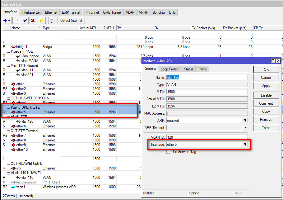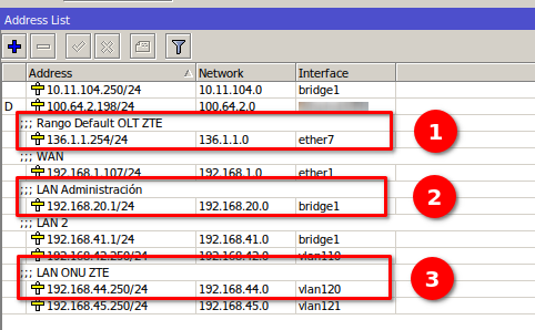 - 1.- Agregamos el segmento default de la OLT: 136.1.1.254/24 para que el Mikrotik tenga comunicación con la OLT