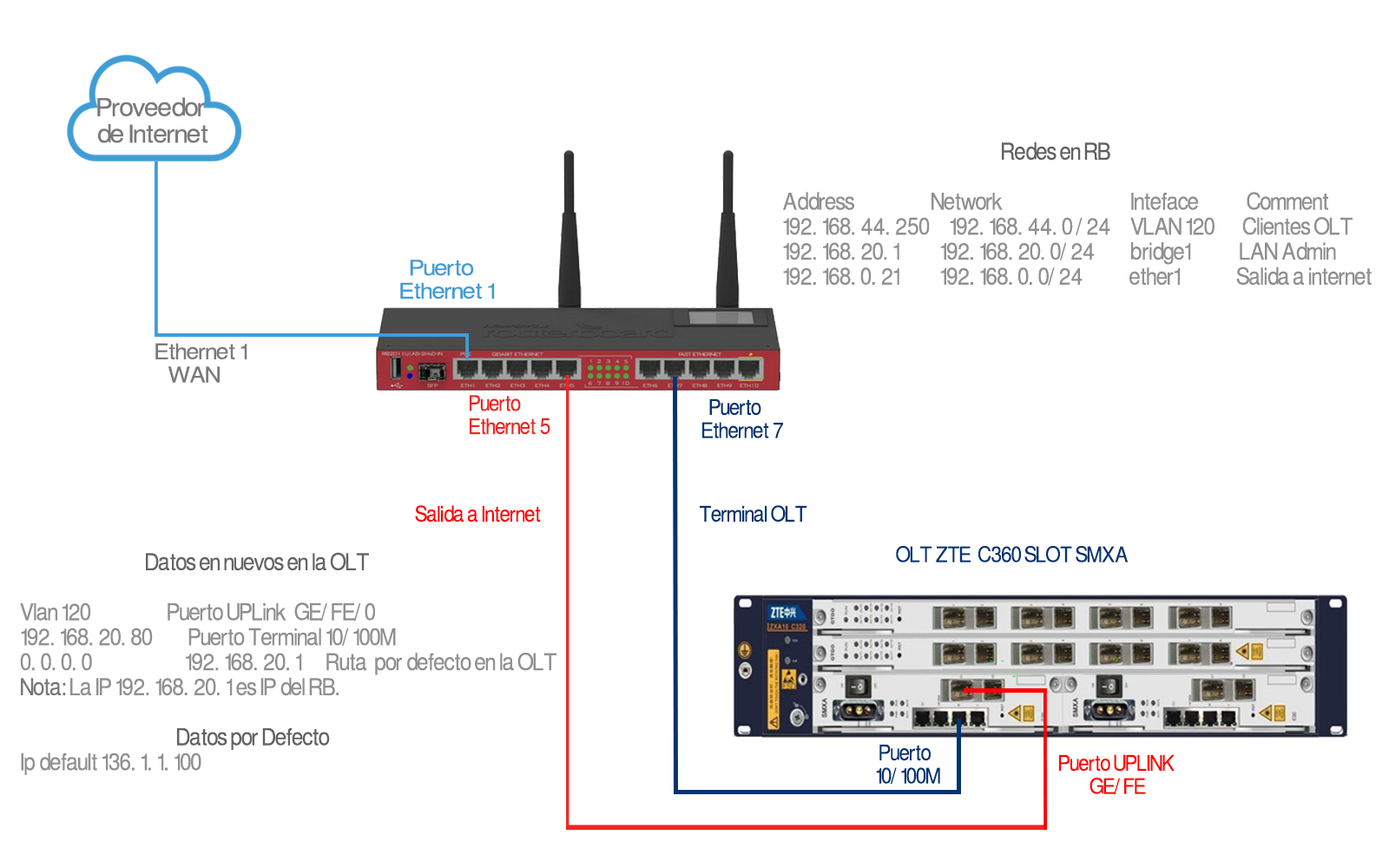Para tener más clara como se estructura la conexión de la OLT al momento de realizar la configuración, puede apoyarse del siguiente diagrama, donde se muestra la conexión física.