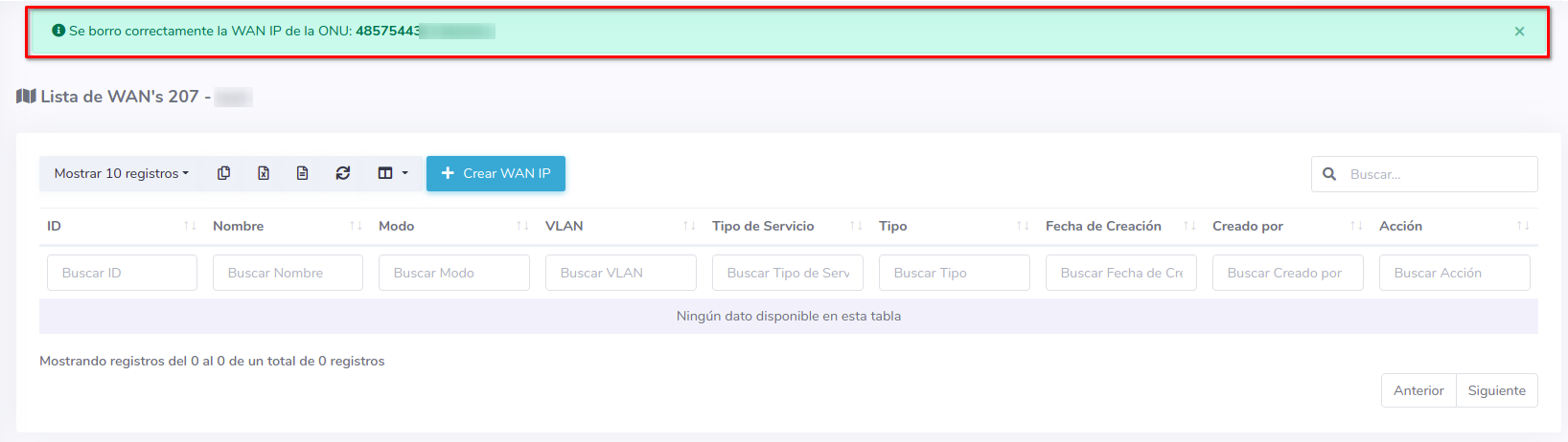 2Seleccione la opción Crear WAN IP y complete el formulario, con este proceso podrá autorizar y crear una WAN IP a una ONU al mismo tiempo.