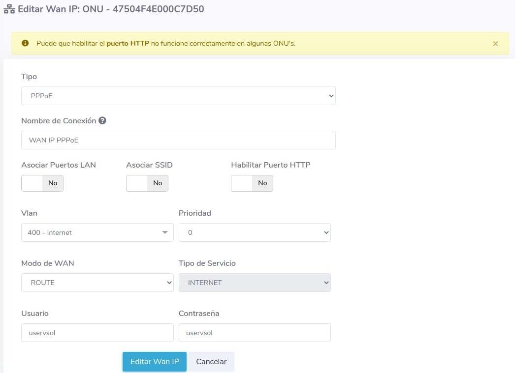 2Seleccione la opción Crear WAN IP y complete el formulario, con este proceso podrá autorizar y crear una WAN IP a una ONU al mismo tiempo.