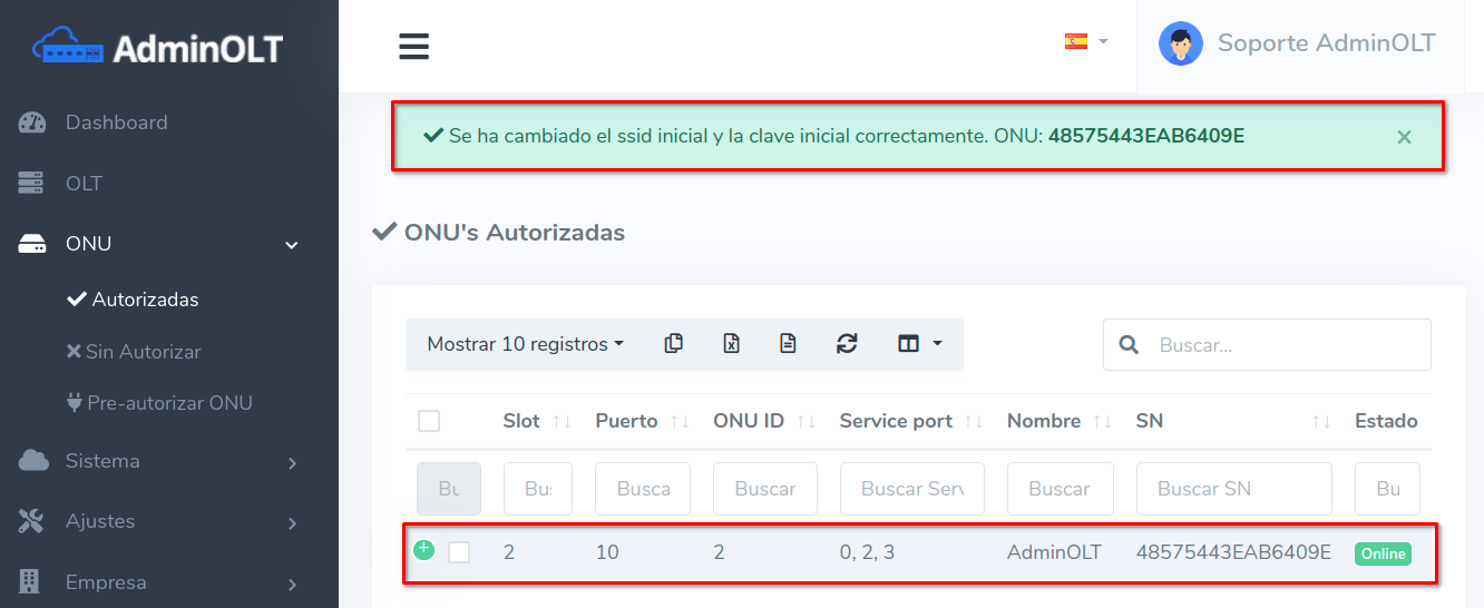 Es importante mencionar que esta información solo será guardada en AdminOLT y no se creará directamente en la ONU, para esto debemos de Aplicar Configuraciones de Fabrica TR069