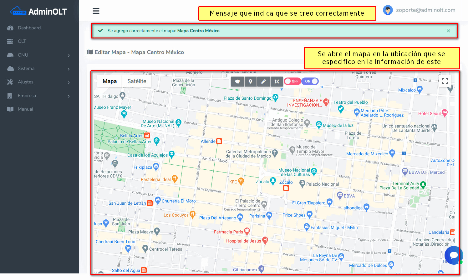 Para poder crear un mapa en AdminOLT es importante que antes haya hecho una serie de pasos que explican en el artículo ¿Como configurar mi AdminOLT para crear Mapas?, una vez hechas estas configuraciones puede seguir con las siguientes instrucciones.