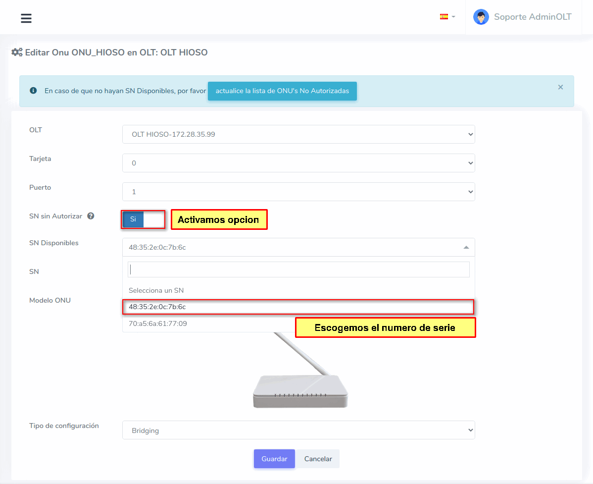 Editar ONU Hioso por Numero de Serie (SN)