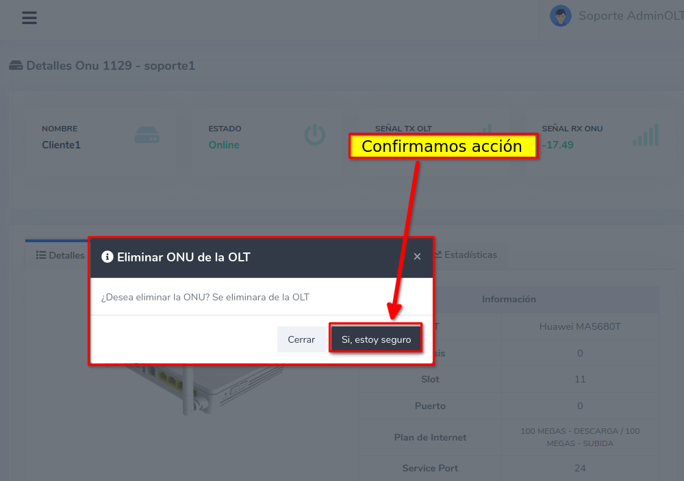 Eliminar ONU de AdminOLT y OLT desde Detalles de la ONU.