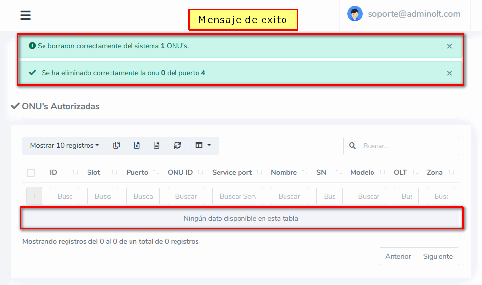 Eliminar ONU de la OLT desde acciones masivas en Lista de ONU's Autorizadas