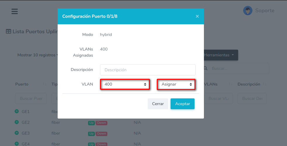 Puede escribir una descripción y escoger entre asignar o remover la VLAN