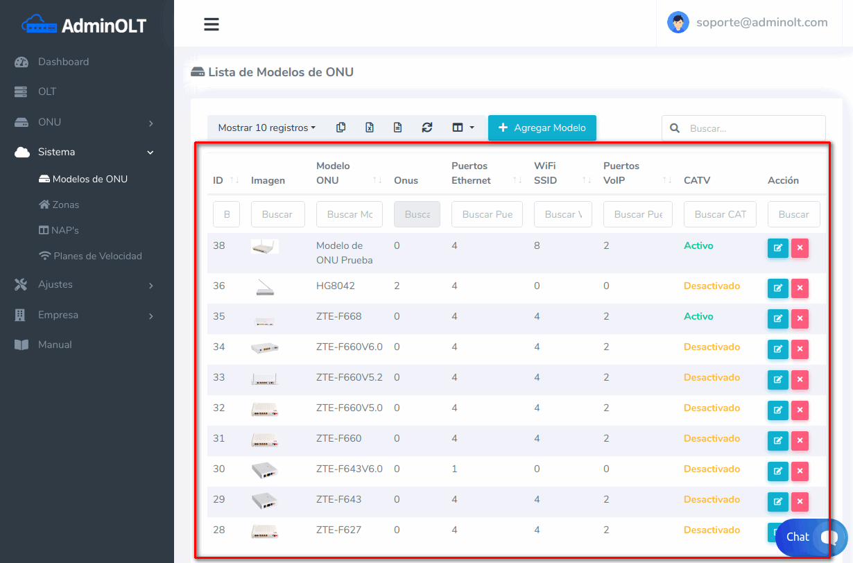 2 Una vez en la Lista de Modelos de ONU. Esto nos mostrara una lista con todas los Modelos de ONU's con las que contamos actualmente en AdminOLT. Para agregar un nuevo Modelo de ONU debemos seleccionar la opción Agregar Modelo.